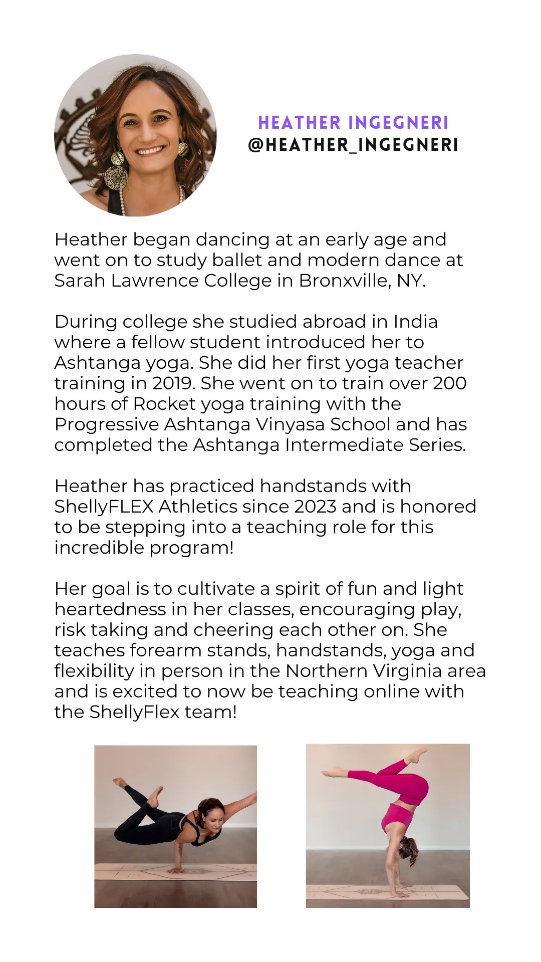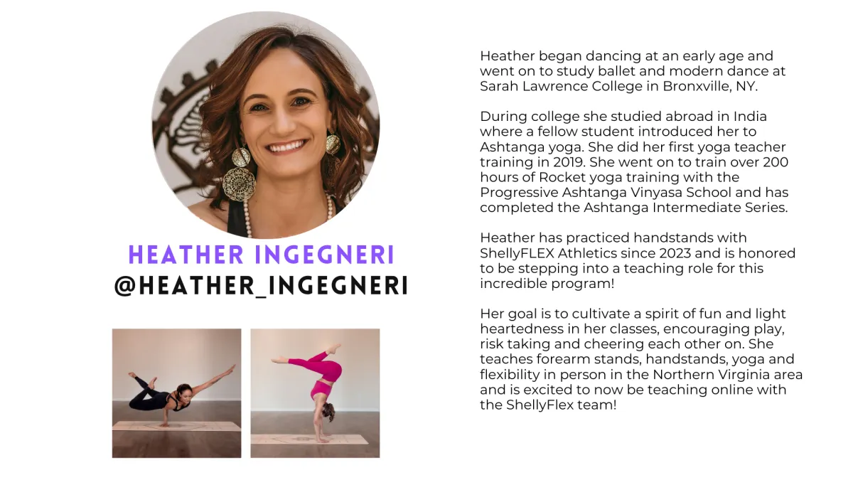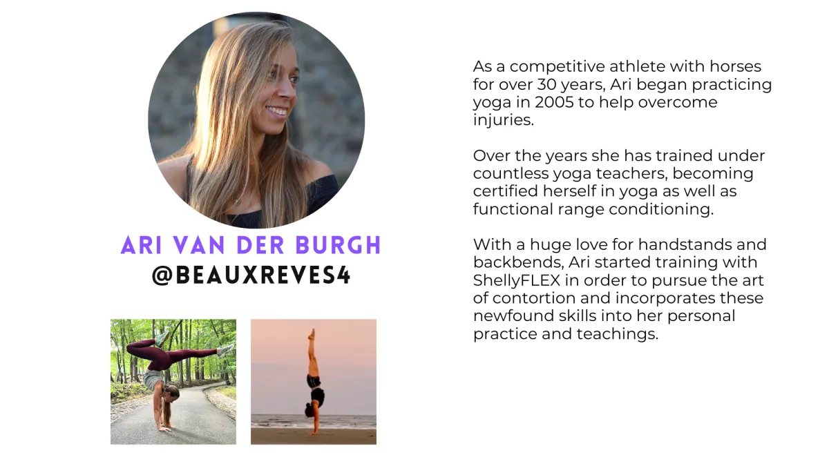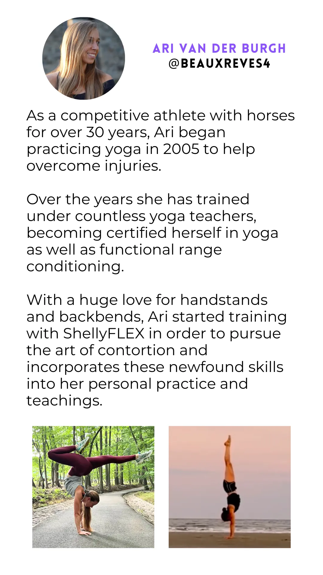 With a huge love for handstands and backbends, Ari started training with ShellyFLEX in order to pursue the art of contortion and incorporates these newfound skills into her personal practice and teachings.