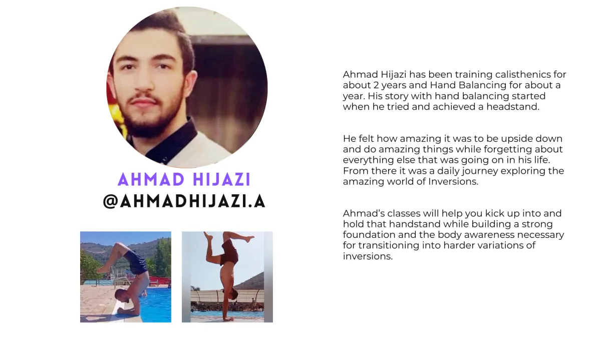 Ahmad Hijazi has been training calisthenics for about 2 years and Hand Balancing for about a year. His story with hand balancing started when he tried and achieved a headstand.