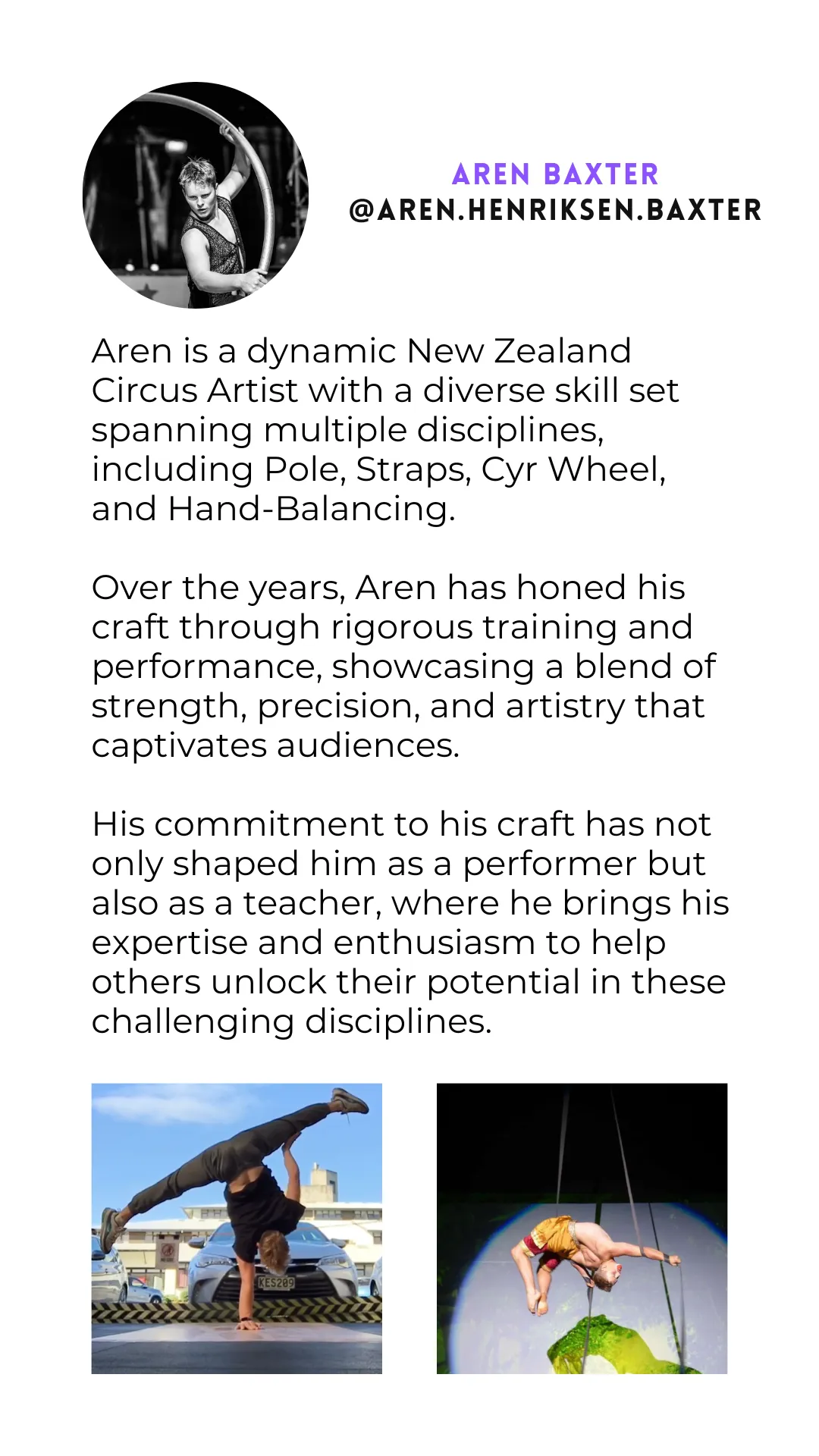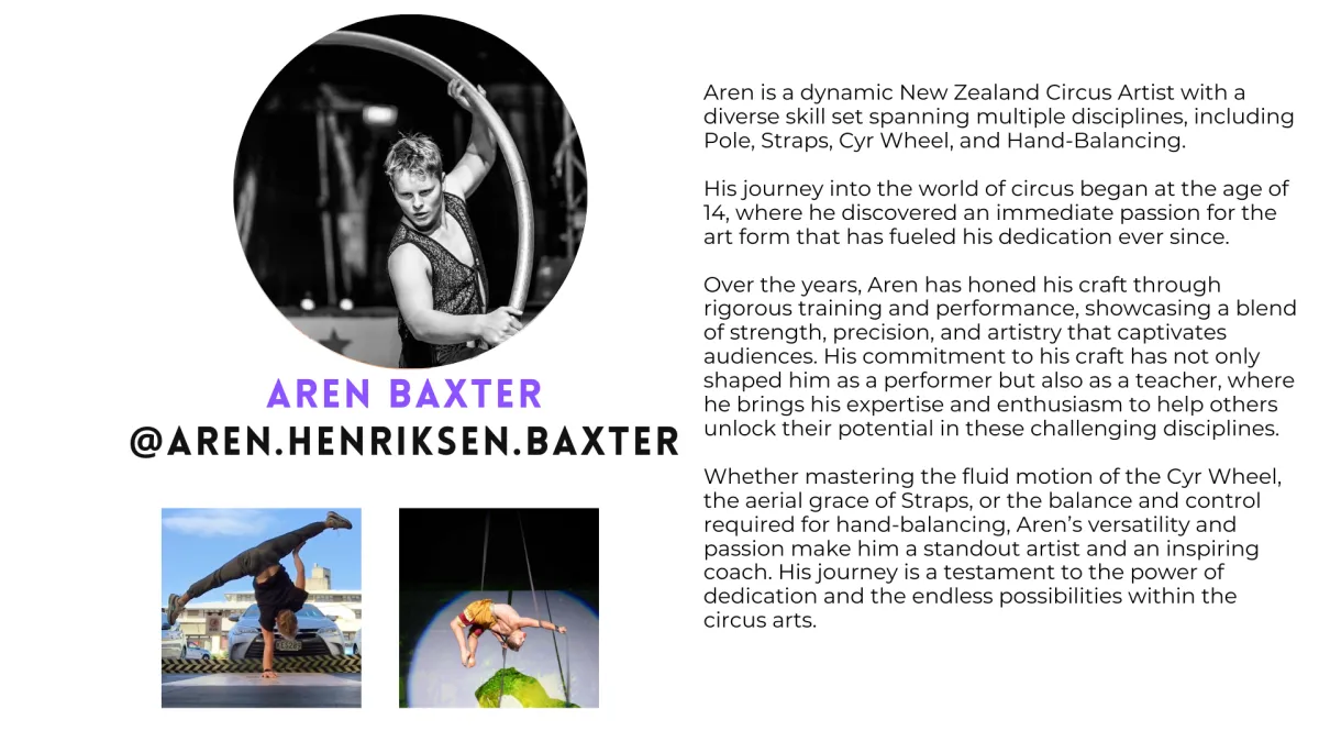 Aren is a New Zealand Circus Artist specializing in multiple different disciplines including Pole Straps Cyr Wheel and hand-balancing, started circus when he was 14 and found immediate passion for it and haven't stopped since.