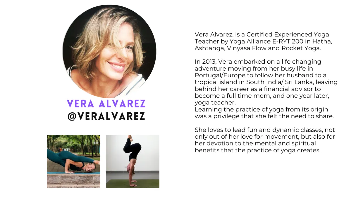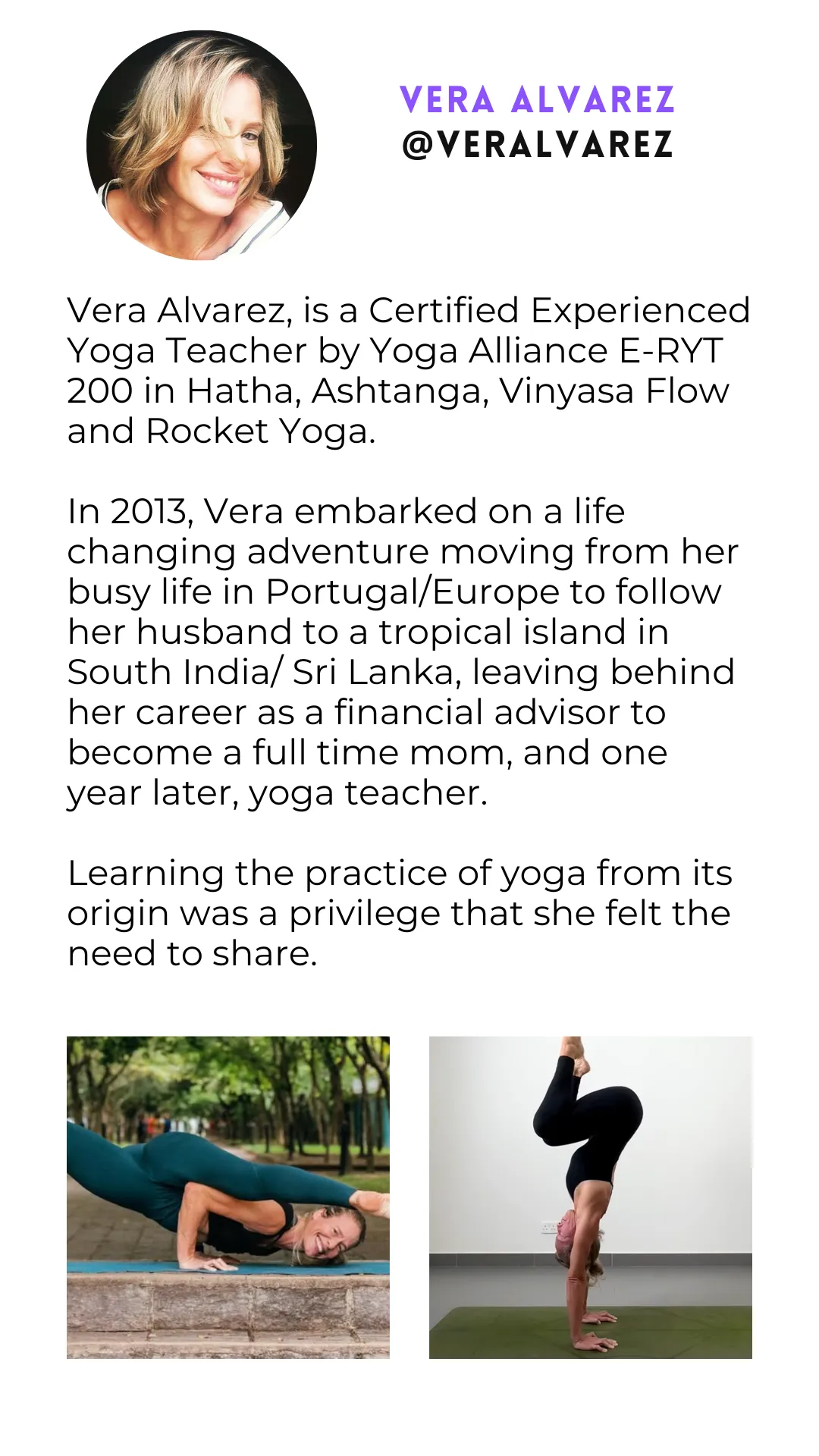In 2013, Vera embarked on a life changing adventure moving from her busy life in Portugal/Europe to follow her husband to a tropical island in South India/ Sri Lanka, leaving behind her career as a financial advisor to become a full time mom, and one year later, yoga teacher.