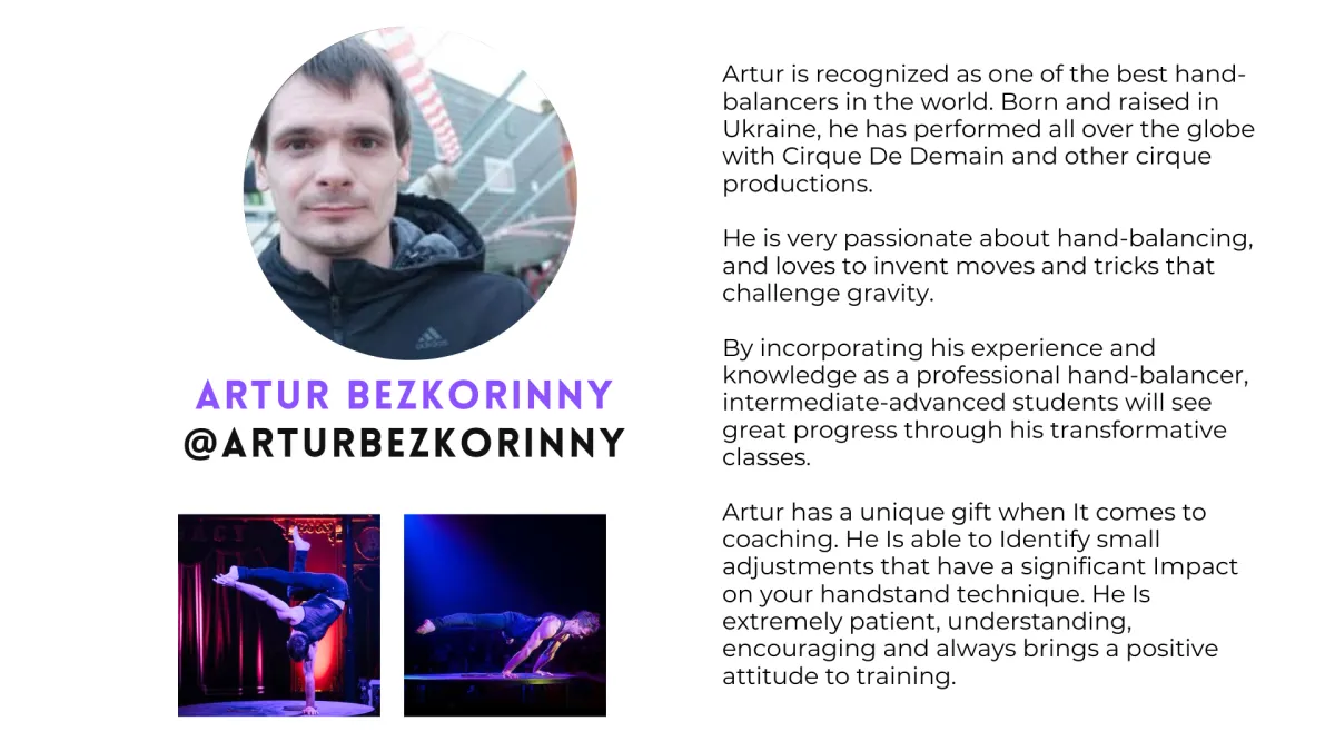By incorporating his experience and knowledge as a professional hand-balancer, intermediate-advanced students will see great progress through his transformative classes.