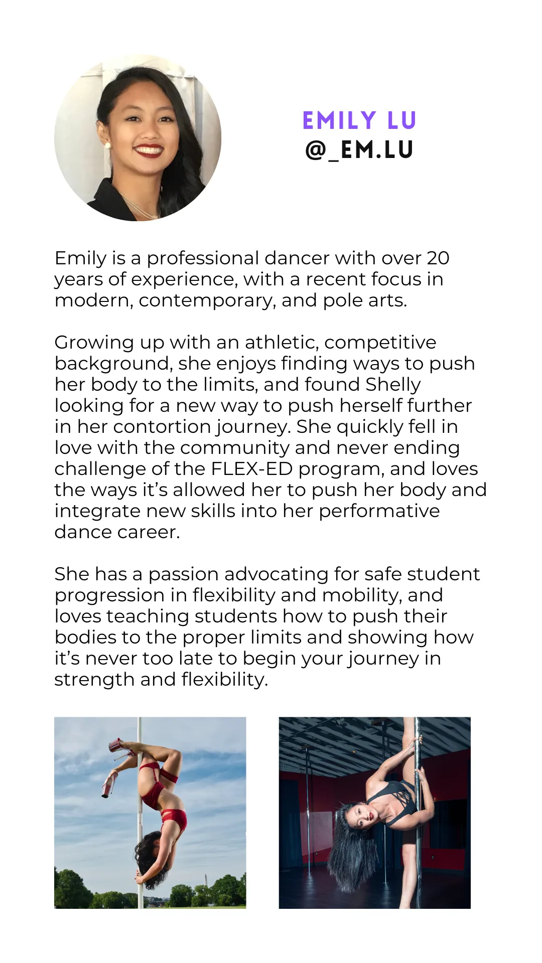 Emily is a professional dancer with over 20 years of experience, with a recent focus in modern, contemporary, and pole arts.