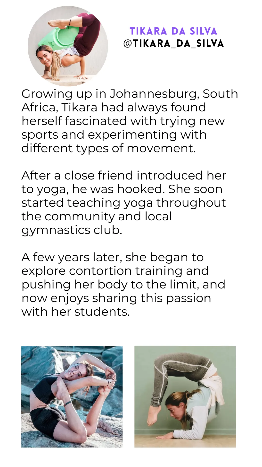 A few years later, she began to explore contortion training and pushing her body to the limit, and now enjoys sharing this passion with her students.